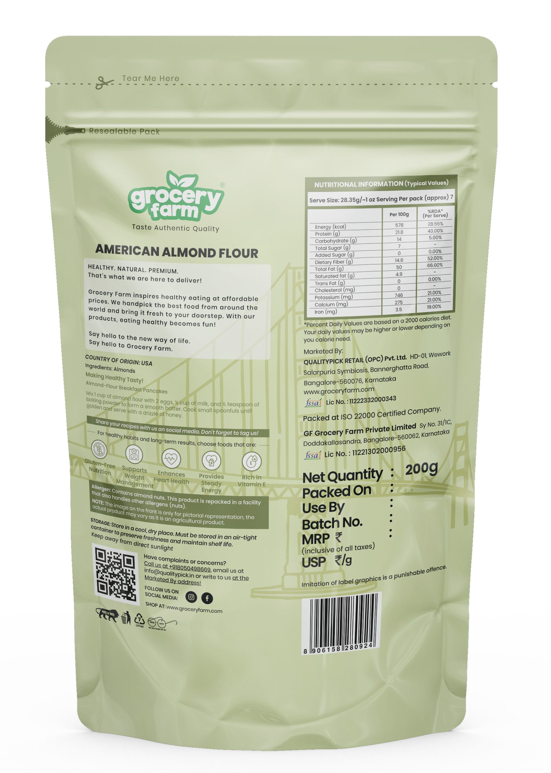 Grocery Farm’s Premium Almond Flour is finely ground from high-quality almonds and is rich in protein, healthy fats, and fibre. Light, nutritious, and naturally gluten-free, it’s perfect for baking, cooking, and guilt-free treats.